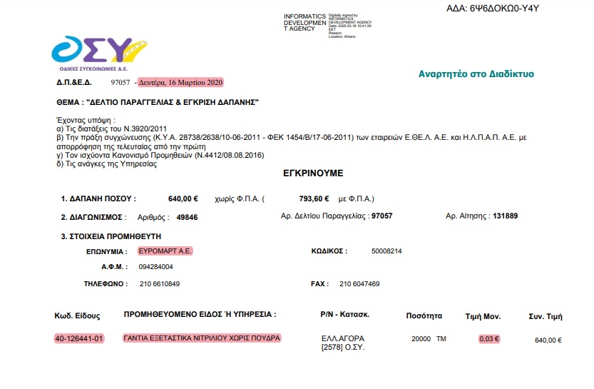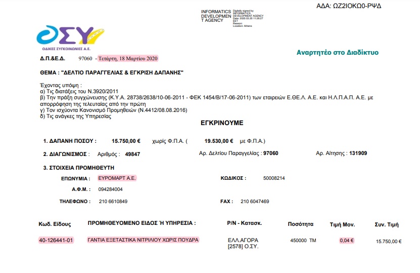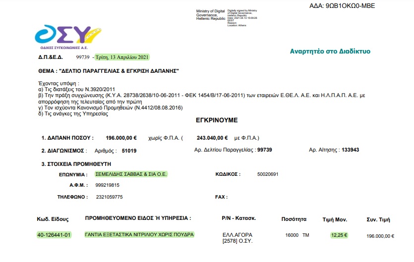 • 16 χιλιάδες κουτιά γάντια (των 100 τεμαχίων) προς 12,25 ευρώ το κουτί στις 13 Απριλίου 2021.