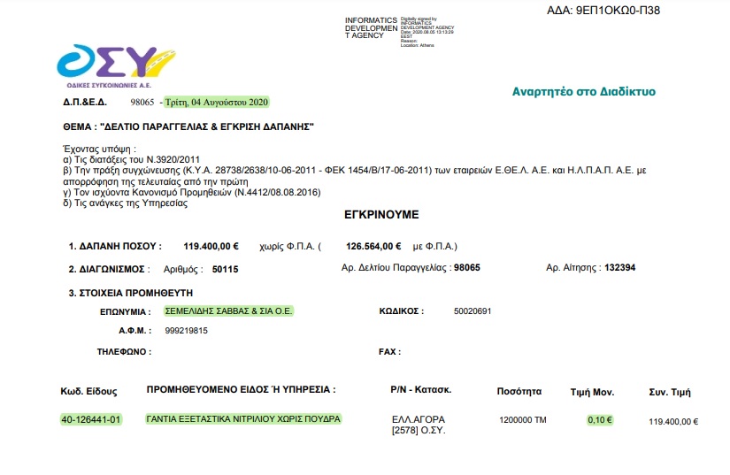 • 12 χιλιάδες κουτιά γάντια (των 100 τεμαχίων) προς 10 ευρώ το κουτί στις 4 Αυγούστου 2020.