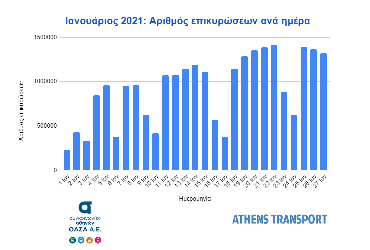 Τον Ιανουάριο* του 2021 πραγματοποιήθηκαν συνολικά 24.821.809 επικυρώσεις εισιτηρίων. Ο ημερήσιος μέσος όρος έφτασε τις 919.326 επικυρώσεις.