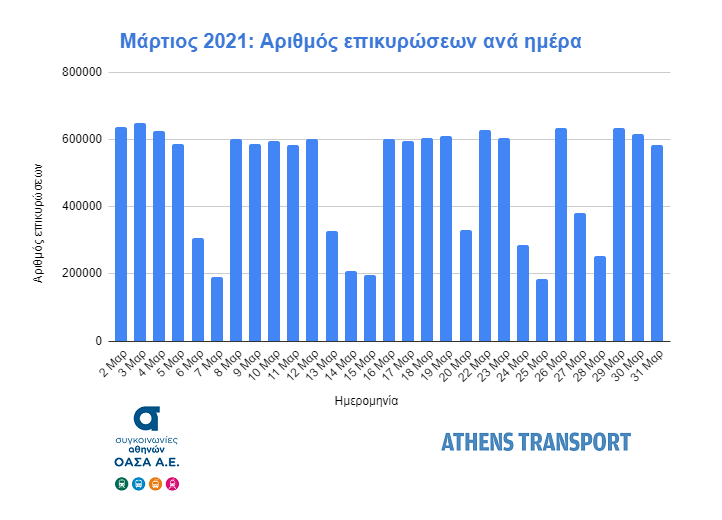 Τον Μάρτιο* του 2021 πραγματοποιήθηκαν συνολικά 14.242.286 επικυρώσεις εισιτηρίων (αύξηση 5% σε σχέση με τον Φεβρουάριο). Ο μέσος όρος των ημερήσιων επικυρώσεων ήταν 491.113 (μείωση 9% από τον προηγούμενο μήνα).