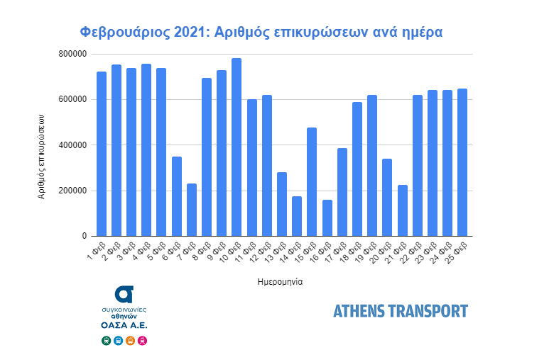 *Σημειώνεται ότι τα δεδομένα του ΟΑΣΑ είναι ελλιπή (υπερβολικά χαμηλοί αριθμοί που δεν δικαιολογούνται) μεταξύ των ημερομηνιών 28 Ιανουαρίου έως και 31 Ιανουαρίου και γι’ αυτό οι μέρες αυτές δεν περιλαμβάνονται στο διάγραμμα και τους υπολογισμούς.