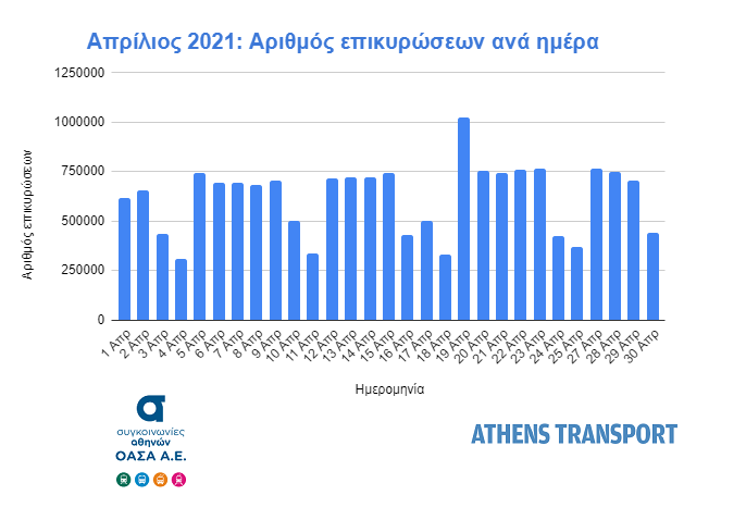 Τον Απρίλιο* του 2021 πραγματοποιήθηκαν συνολικά 18.028.952 επικυρώσεις εισιτηρίων, αριθμός αυξημένος κατά 26,6% σε σχέση με τον Μάρτιο. Ο ημερήσιος μέσος όρος των επικυρώσεων ανήλθε σε 621.688, αυξημένος επίσης κατά 26,6% από τον προηγούμενο μήνα.