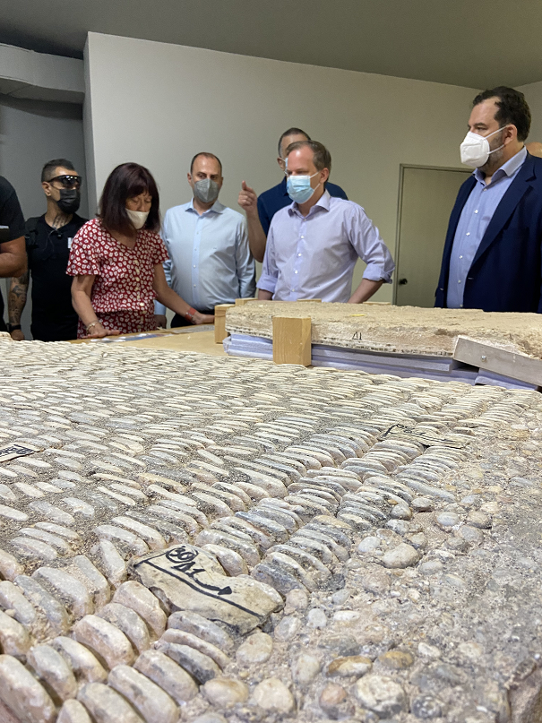 Ο κ. Καραμανλής ξεναγήθηκε στην έκθεση αρχαιοτήτων, τμήμα της οποίας θα γίνει ενιαίο, στο Σταθμό «Δημοτικό Θέατρο» και η οποία περιλαμβάνει ένα βοτσαλωτό δάπεδο, που έγινε απόσπαση, συντηρήθηκε και θα γίνει επανατοποθέτηση σε ειδικό χώρο στον εν λόγω σταθμό.