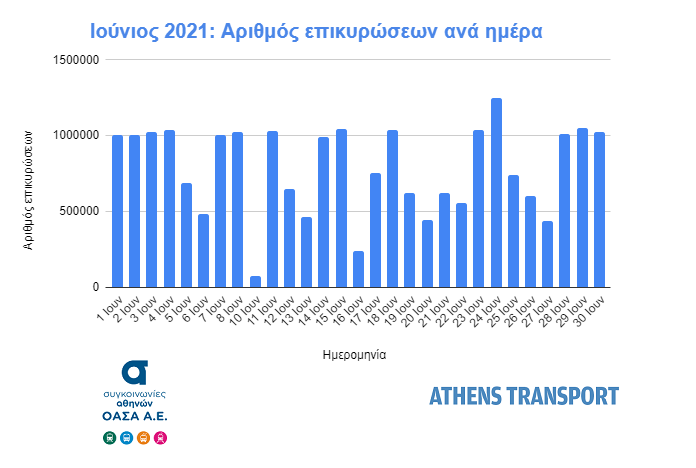 Τον Ιούνιο του 2021* καταγράφηκαν 22.970.278 επικυρώσεις εισιτηρίων, αριθμός αυξημένος κατά 11,7% σε σχέση με το Μάιο. Ο ημερήσιος μέσος όρος των επικυρώσεων ανήλθε σε 792.079, αυξημένος κατά 7,9% από τον προηγούμενο μήνα.