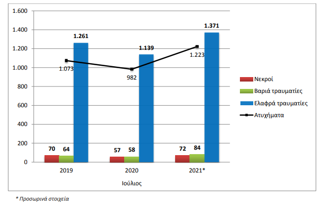 Ενδεικτικά είναι τα προσωρινά στοιχεία της ΕΛΣΤΑΤ για το μήνα Ιούλιο όταν σε όλη τη χώρα καταγράφηκαν 1.223 τροχαία ατυχήματα, από 982 την περασμένη χρονιά (αύξηση 24,5%) και από 1.073 το 2019. Τον ίδια μήνα, ο αριθμός των νεκρών έφτασε τους 72 πανελλαδικά από 57 τον Ιούλιο του 2020 (αύξηση 26,3%) και τους 70 δύο χρόνια πριν.
