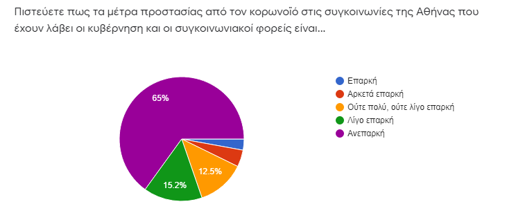 Σχεδόν 2 στους τρεις (65% – από 53% πέρυσι) απάντησαν πως τα μέτρα προστασίας από τον κορωνοϊό στις συγκοινωνίες της Αθήνας που έχουν λάβει η κυβέρνηση και οι συγκοινωνιακοί φορείς είναι ανεπαρκή. Το 15,2% τα χαρακτήρισε λίγο επαρκή, το 12,5% ούτε πολύ, ούτε λίγο επαρκή και μόνο το 7,9% τα χαρακτήρισε αρκετά επαρκή ή επαρκή.