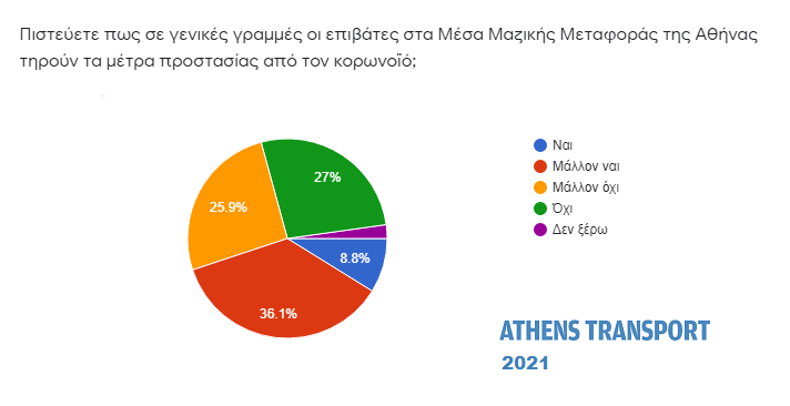 Ερωτώμενοι αν σε γενικές γραμμές οι επιβάτες στα Μέσα Μαζικής Μεταφοράς της Αθήνας τηρούν τα μέτρα προστασίας από τον κορωνοϊό, λίγοι παραπάνω από τους μισούς (52,9%) απάντησαν όχι ή μάλλον όχι. Ναι ή μάλλον ναι απάντησε το 44,9%.