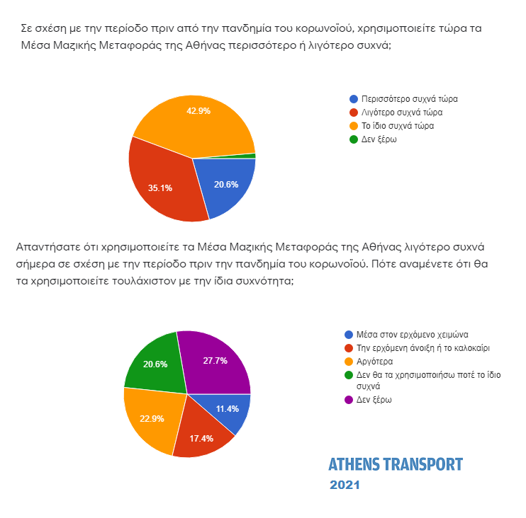 Στη συνέχεια, όσοι απάντησαν πως χρησιμοποιούν τις συγκοινωνίες της Αθήνας λιγότερο συχνά σήμερα, ρωτήθηκαν πότε αναμένουν ότι θα τα χρησιμοποιούν και πάλι με την ίδια συχνότητα όπως και πριν. Οι λιγότεροι (11,4%) απάντησαν μέσα στον επόμενο χειμώνα, το 17,4% την ερχόμενη άνοιξη ή το καλοκαίρι, το 22,9% αργότερα, ενώ το 20,6% απάντησε πως δεν θα χρησιμοποιήσουν ποτέ τα Μέσα Μαζικής Μεταφοράς το ίδιο συχνά. Οι περισσότεροι πάντως (27,7%) απάντησαν πως δεν γνωρίζουν πότε θα αυξήσουν τις μετακινήσεις τους με τις συγκοινωνίες.