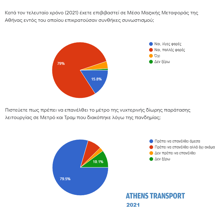 Οι περισσότεροι (79,5%) πιστεύουν ότι πρέπει να επανέλθει άμεσα το μέτρο της νυχτερινής δίωρης παράτασης λειτουργίας σε Μετρό και Τραμ το οποίο διακόπηκε λόγω της πανδημίας. Το 8,1% απάντησε πως πρέπει να επανέλθει αλλά όχι ακόμα και μόνο το 2,3% πως δεν πρέπει να επανέλθει.