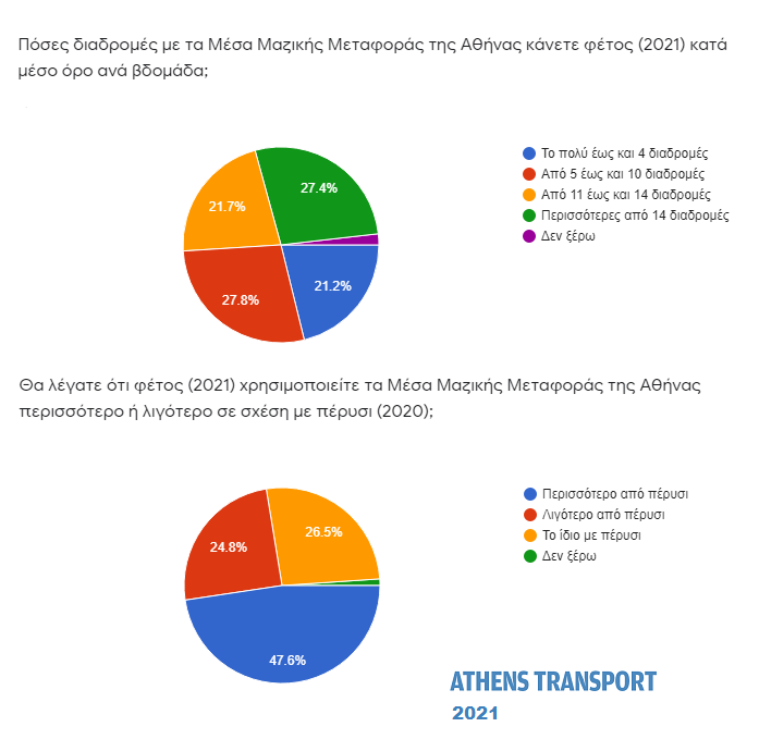 Σχεδόν οι μισοί (47,4% – από 18% πέρυσι) απάντησαν πως φέτος χρησιμοποιούν τα Μέσα Μαζικής Μεταφοράς της Αθήνας περισσότερο από πέρυσι. Το 26,5% απάντησε το ίδιο με πέρυσι και το 24,8% (πέρυσι 45,5%) απάντησε λιγότερο από πέρυσι.