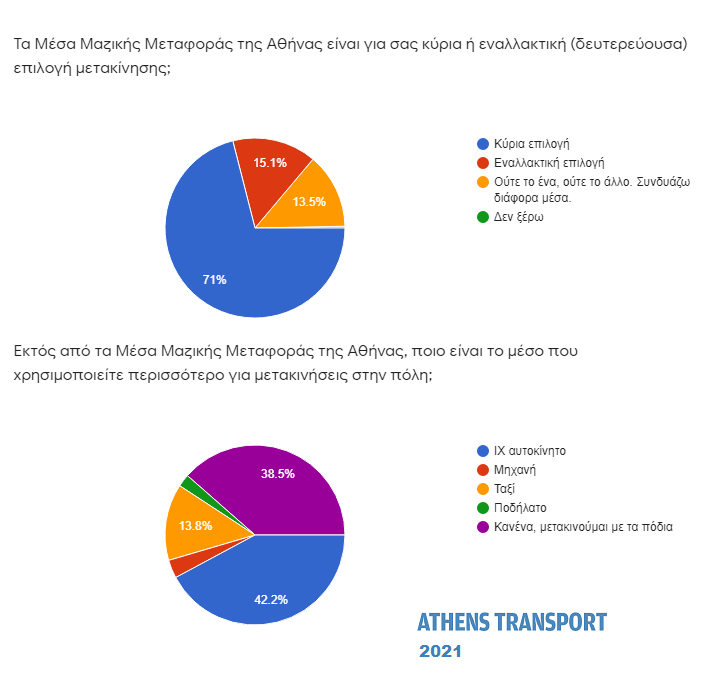 Το 42,2% (από 37,6% πέρυσι) απάντησε πως πέραν των Μέσων Μαζικής Μεταφοράς χρησιμοποιεί και Ι.Χ. αυτοκίνητο για τη μετακίνησή του στην Αθήνα. Το 38,5% (από 42,7% πέρυσι) απάντησε πως δεν χρησιμοποιεί κάποιο άλλο μέσο αλλά μετακινείται με τα πόδια. Το 13,8% μετακινείται με ταξί, το 3,3% με μηχανή και το 2,3% με ποδήλατο. Όπως πρότεινε αναγνώστης, στην επόμενη έρευνα η συγκεκριμένη ερώτηση θα περιλαμβάνει και ξεχωριστή επιλογή για scooter και λοιπά μέσα μικροκινητικότητας.