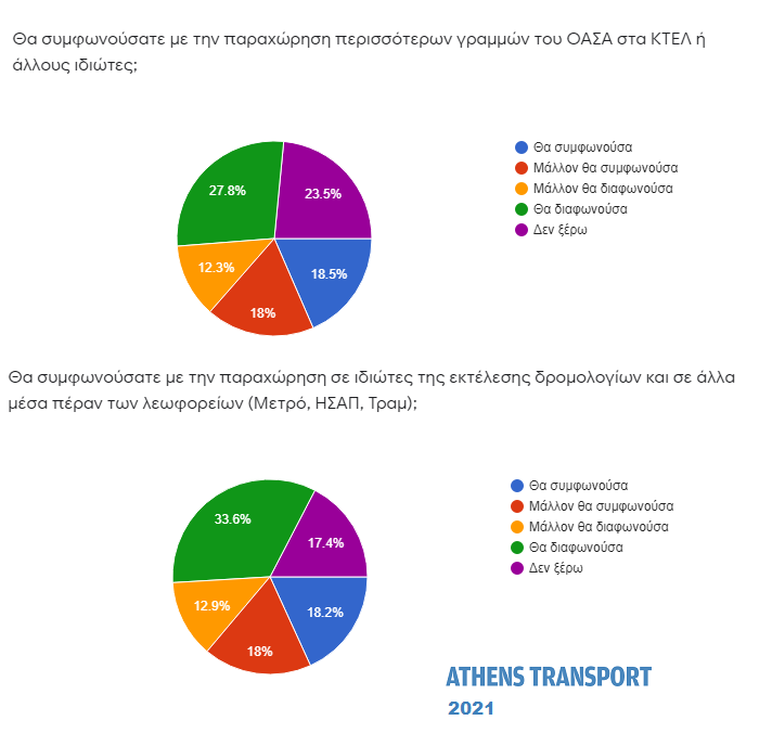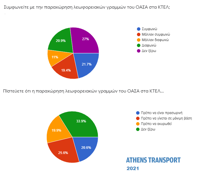 Ένας στους τέσσερις (25,6%) απάντησαν πως η παραχώρηση λεωφορειακών γραμμών του ΟΑΣΑ στα ΚΤΕΛ πρέπει να γίνεται σε μόνιμη βάση. Το 20,6% απάντησε πως πρέπει να είναι προσωρινή και το 19,9% πως πρέπει να ακυρωθεί. Το 33,9% δεν εκφέρει άποψη.