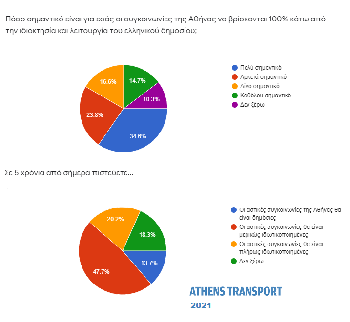 Για την πλειοψηφία (34,6%) είναι πολύ σημαντικό οι συγκοινωνίες της Αθήνας να βρίσκονται κατά 100% κάτω από τον έλεγχο και τη λειτουργία του ελληνικού δημοσίου. Για το 23,8% είναι αρκετά σημαντικό, για το 16,6% λίγο σημαντικό και για το 14,7% καθόλου σημαντικό.