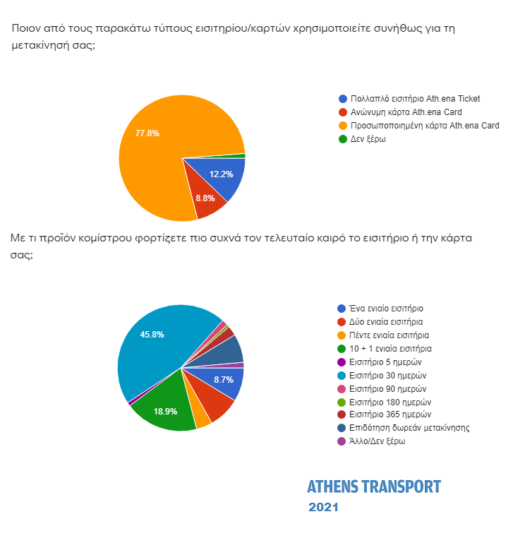 To 77,8% απάντησε πως χρησιμοποιεί προσωποποιημένη κάρτα Athena Card για τις μετακινήσεις του, το 12,2% πολλαπλό εισιτήριο Athena Ticket και το 8,8% ανώνυμη κάρτα Athena Card.