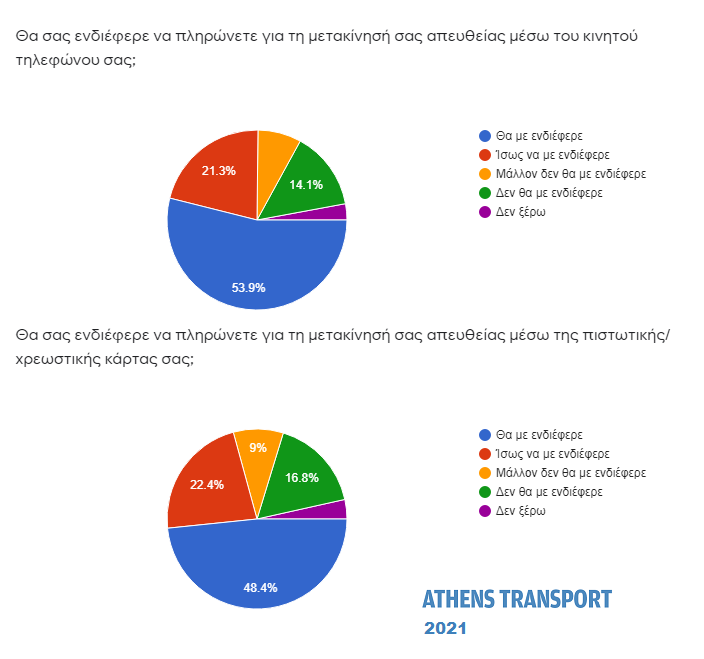 Τρεις στους 4 (75,2% – από 66,4% πέρυσι) απάντησαν πως θα τους ενδιέφερε ή ίσως να τους ενδιέφερε να πληρώσουν για τη μετακίνησή τους απευθείας μέσω κινητού τηλεφώνου. Το 21,9% απάντησε πως δεν θα τους ενδιέφερε ή μάλλον δεν θα τους ενδιέφερε.