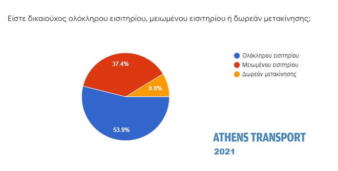 Το 53,9% όσων απάντησαν στην έρευνα είναι δικαιούχοι ολόκληρου εισιτηρίου. Το 37,4% δικαιούχοι μειωμένου εισιτηρίου και το 8,8% δικαιούχοι δωρεάν μετακίνησης.
