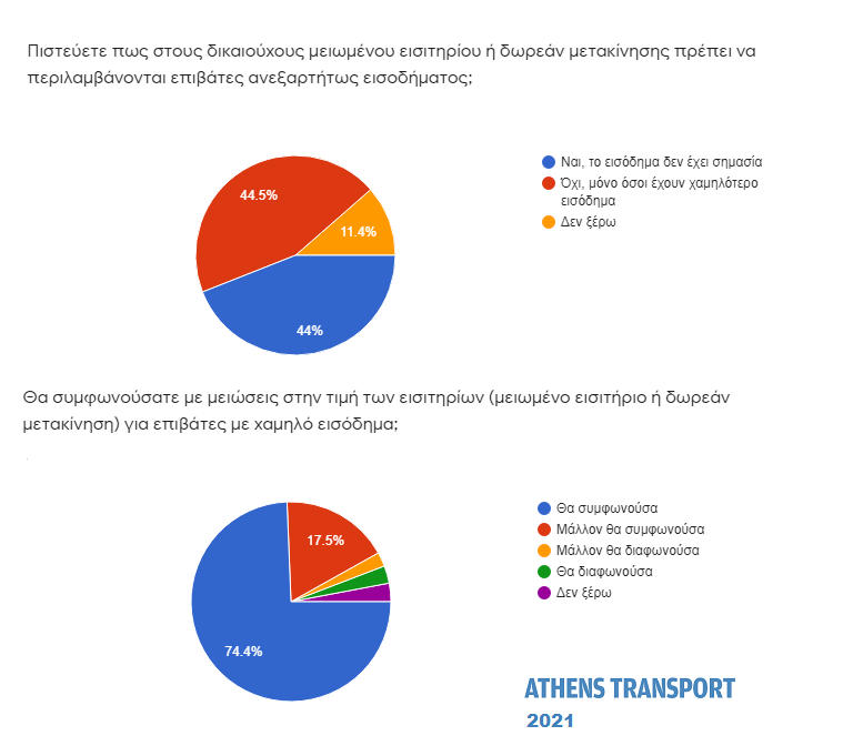 Οι απόψεις είναι διχασμένες σχετικά με το αν στους δικαιούχους μειωμένου εισιτηρίου ή δωρεάν μετακίνησης πρέπει να περιλαμβάνονται μόνο όσοι έχουν χαμηλότερο εισόδημα ή όλοι ανεξαρτήτως εισοδήματος. Το 44,5% πιστεύει πως πρέπει να περιλαμβάνονται μόνο όσοι έχουν χαμηλότερο εισόδημα και το 44% όλοι ανεξαρτήτως εισοδήματος, όπως σήμερα.
