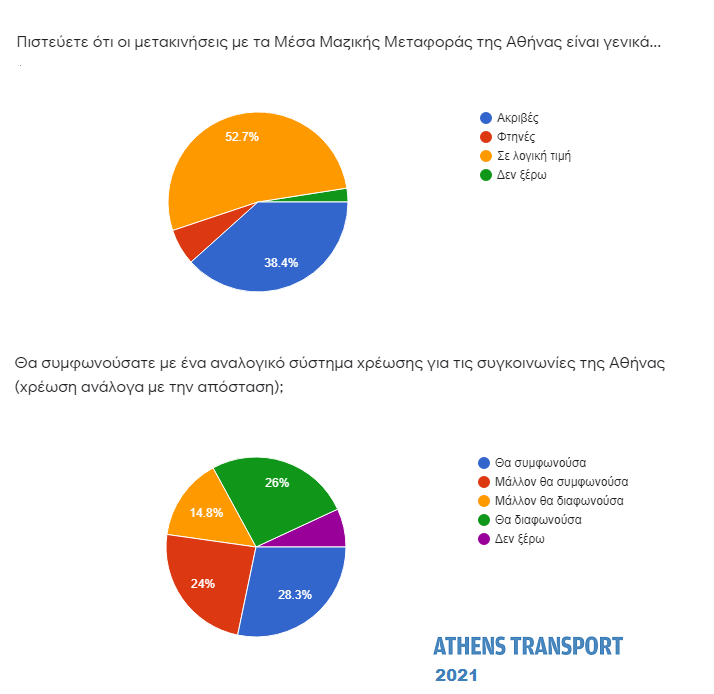 - 52,7%: «η τιμή των εισιτηρίων σήμερα είναι λογική» 56,7%: «οι τιμές των εισιτηρίων πρέπει να μειωθούν», το 52,3% ζητά δωρεάν συγκοινωνίες για όλους.