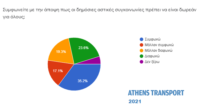 Το 52,3% (από 50% πέρυσι) συμφωνεί ή μάλλον συμφωνεί με την άποψη πως οι δημόσιες αστικές συγκοινωνίες πρέπει να είναι δωρεάν για όλους. Το 42,9% (από 45,1% πέρυσι) διαφωνεί ή μάλλον διαφωνεί με την άποψη αυτή.