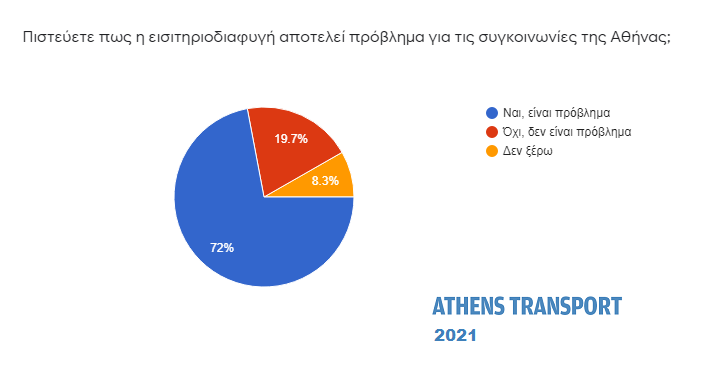 Το 72% (από 77,6% πέρυσι) πιστεύει ότι η εισιτηριοδιαφυγή αποτελεί πρόβλημα για τις συγκοινωνίες της Αθήνας. Αντίθετη άποψη έχει το 19,7%.