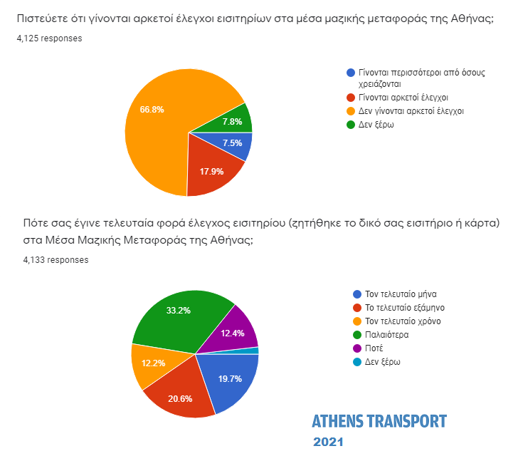 Δύο στους τρεις (66,8% – από 67,9% πέρυσι) πιστεύουν ότι δεν γίνονται αρκετοί έλεγχοι εισιτηρίων στα μέσα μαζικής μεταφοράς της Αθήνας. Το 17,9% πιστεύει ότι γίνονται αρκετοί έλεγχοι και το 7,5% πως γίνονται περισσότεροι από όσους χρειάζονται.