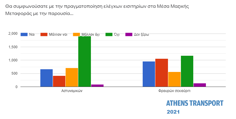 Το 68,9% (από 53,8% πέρυσι) θα διαφωνούσε ή μάλλον θα διαφωνούσε με την πραγματοποίηση ελέγχων εισιτηρίων στα Μέσα Μαζικής Μεταφοράς με την παρουσία αστυνομικών, ενώ το 28,6% θα συμφωνούσε ή μάλλον θα συμφωνούσε (από 42,6% πέρυσι).