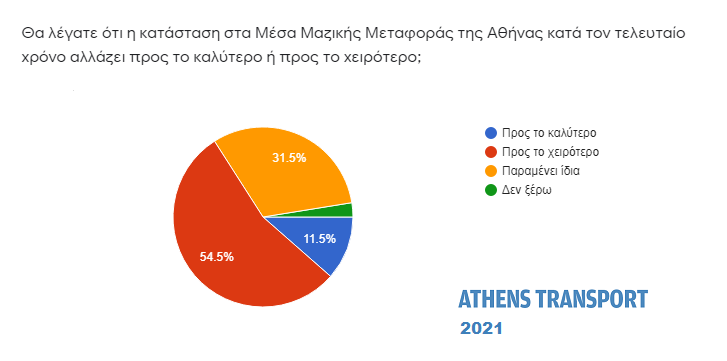 Οι περισσότεροι (54,5% – από 43,6% πέρυσι) πιστεύουν ότι η κατάσταση στα Μέσα Μαζικής Μεταφοράς της Αθήνας κατά τον τελευταίο χρόνο αλλάζει προς το χειρότερο. Το 31,5% πιστεύει ότι παραμένει ίδια και το 11,5% (από 15,3% πέρυσι) πως αλλάζει προς το καλύτερο.