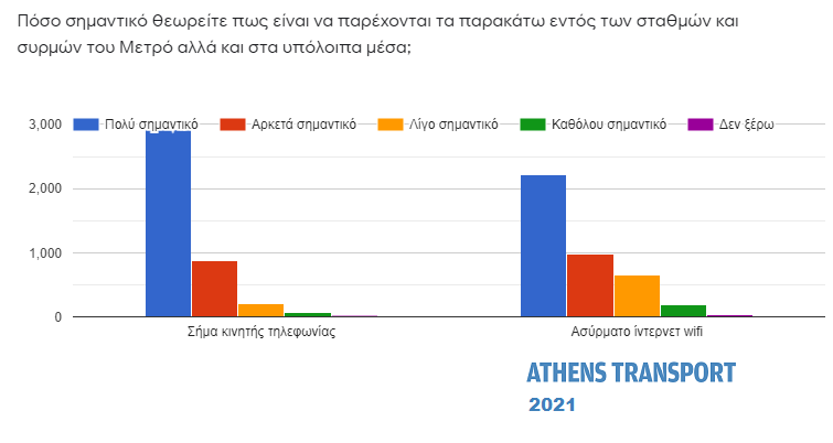 Το 71,6% (από 69,6% πέρυσι) θεωρεί ως πολύ σημαντικό να παρέχεται σήμα κινητής τηλεφωνίας εντός των σταθμών και συρμών του Μετρό. Το 21,7% το θεωρεί αρκετά σημαντικό, το 5,1% λίγο σημαντικό και το 1,7% καθόλου σημαντικό.