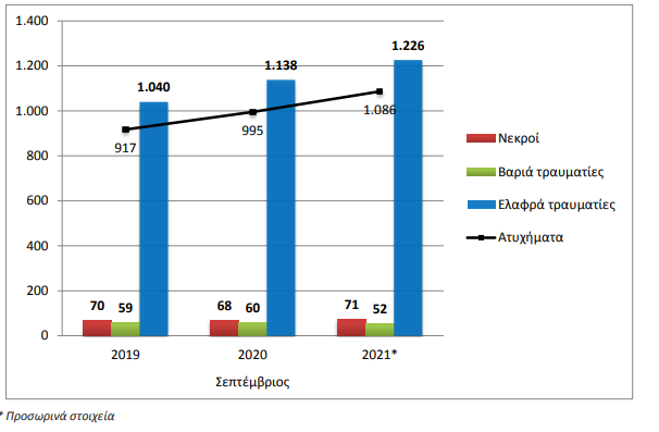 Σύμφωνα με τα προσωρινά στοιχεία της ΕΛΣΤΑΤ για το Σεπτέμβριο, τα οδικά τροχαία ατυχήματα που συνέβησαν σε ολόκληρη τη χώρα και προκάλεσαν τοv θάνατο ή τον τραυματισμό ατόμων, αυξήθηκαν κατά 9,1% σε σύγκριση με τον αντίστοιχο μήνα του 2020 (1.086 Σεπτέμβριο του 2021, έναντι 995 το Σεπτέμβριο του 2020). Ο αντίστοιχος αριθμός το 2019 ήταν 917 ατυχήματα.