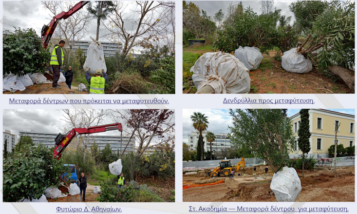 Οι μεταφυτεύσεις έχουν ήδη ξεκινήσει και έτσι δέντρα από τα εργοτάξια των σταθμών Κολωνάκι, Ακαδημίας και Αλεξάνδρας μεταφυτεύονται σε διάφορα σημεία της πόλης. Πιο συγκεκριμένα, νεραντζιές, ελιές πλατάνια, μποχίνιες, πορτοκαλιές μεταφυτεύονται στο Πάρκο Μαιάνδρου, την Πλατεία Μαδρίτης και στη συνέχεια έπονται μεταφυτεύσεις στο Πάρκο Ελευθερίας και στο τρίγωνο του Δρομέα.