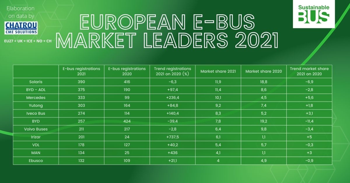 Το 2021 παρατηρήθηκε και η είσοδος νέων παικτών στην αγορά. Ενώ ένα χρόνο νωρίτερα η μισή αγορά ήταν στα χέρια τριών κατασκευαστών (BYD, Solaris και Volvo buses) το 2021 το 50% αποτελούσαν 5 εταιρείες: η Solaris (12% από 20% το 2020), οι BYD – ADL, η Mercedes, η Yutong και η Iveco Bus – Heuliez.