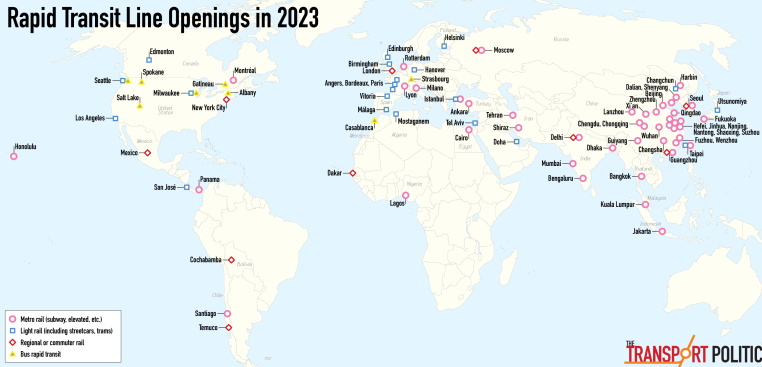 Το 2023, συνολικά 1.760 χιλιόμετρα γραμμών μέσων σταθερής τροχιάς άνοιξαν σε όλο τον κόσμο σύμφωνα με τα δεδομένα που σύλλεξε το thetransportpolitic.com. Σε αυτά περιλαμβάνονται γραμμές Μετρό, Τραμ και άλλων αστικών σιδηροδρομικών μέσων αλλά και γραμμές λεωφορείων BRT που κινούνται δηλαδή σε αποκλειστικούς διαδρόμους. 1.100 νέοι σταθμοί και στάσεις άνοιξαν κατά μήκος αυτών των γραμμών, ενώ πολλοί άλλοι ήδη υπάρχοντες σταθμοί ξεκίνησαν να εξυπηρετούν επιπλέον γραμμές.