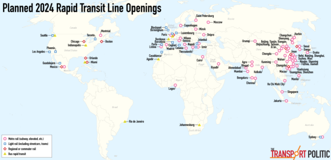 Μεταξύ των χωρών με έργα που σχεδιάζεται να ανοίξουν το 2024, η Κίνα αντιπροσωπεύει και πάλι το 50% των προγραμματισμένων χιλιομέτρων, οι ΗΠΑ το 10%, η Ινδία το 7%, η Σαουδική Αραβία το 6% και η Τουρκία το 4%. Όπως παρατηρούμε και στον παρακάτω χάρτη, η διασπορά των πόλεων παραμένει παρόμοια με αυτή του 2023: