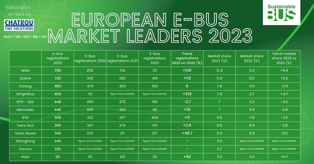 Σύμφωνα με τα στοιχεία που συνέλεξε η ολλανδική εταιρεία Chatrou CME Solution για τις ταξινομήσεις λεωφορείων στην Ευρώπη (27 χώρες ΕΕ συν Νορβηγία, Ισλανδία και Ελβετία) το 2023, η γερμανική MAN ήταν ο κορυφαίος κατασκευαστής ηλεκτρικών λεωφορείων, ενώ ακολούθησαν η Solaris, η Yutong, η οποία το 2022 κατείχε την πρώτη θέση. Τέταρτη ήταν η βρετανική Wrightbus η οποία κατέγραψε εντυπωσιακή αύξηση στις ταξινομήσεις οχημάτων της κατά 319%.