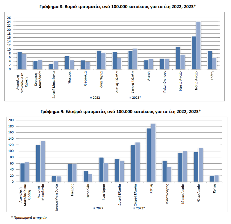 Στους βαριά τραυματίες ο μεγαλύτερος αριθμός αναλογικά με τον πληθυσμό καταγράφηκε με μεγάλη διαφορά, στην Περιφέρεια Νοτίου Αιγαίου ενώ ακολούθησαν η Στερεά Ελλάδα και τα Ιόνια Νησιά. Στους ελαφρά τραυματίες πρώτη ήταν η Περιφέρεια Αττικής και ακολούθησαν η Περιφέρεια Κεντρικής Μακεδονίας και η Περιφέρεια Νοτίου Αιγαίου.
