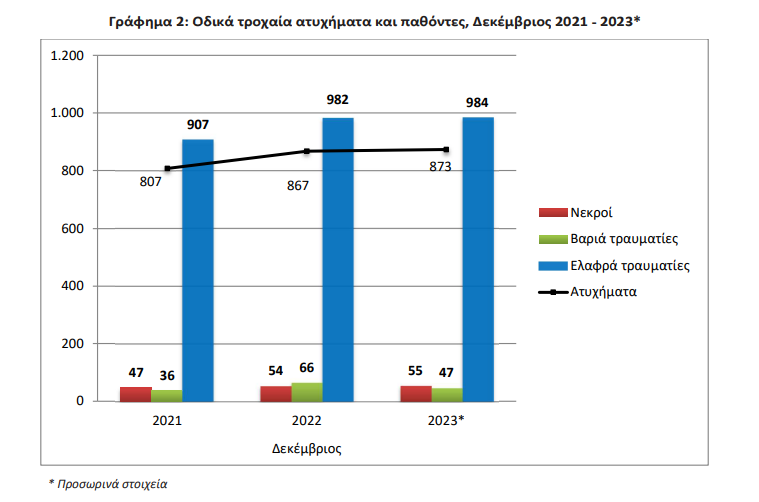 Σύμφωνα με τα προσωρινά στοιχεία της ΕΛ.ΣΤΑΤ. για το Δεκέμβριο του 2023, τα οδικά τροχαία ατυχήματα που συνέβησαν σε ολόκληρη τη χώρα και προκάλεσαν τοv θάνατο ή τον τραυματισμό ατόμων, αυξήθηκαν κατά +0,7% σε σύγκριση με τον αντίστοιχο μήνα του 2022 (873 το Δεκέμβριο του 2023, έναντι 867 το Δεκέμβριο του 2022). Ο αντίστοιχος αριθμός το 2021 ήταν 807 ατυχήματα.
