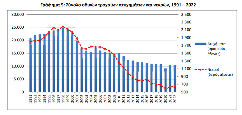 Τέλος, στο γράφημα με τον αριθμό των τροχαίων ατυχημάτων και των νεκρών από το 1991 ως το 2022 παρατηρούμε ότι σε βάθος χρόνου συνεχίζεται με διαφορετικούς ρυθμούς η μείωση των αριθμών από το 1999 έως σήμερα, μετά την κορύφωσή τους τα αμέσως προηγούμενα χρόνια. Ωστόσο, είναι εμφανές πως ο αριθμός των τροχαίων ατυχημάτων έχει σταματήσει να μειώνεται την τελευταία επταετία, ενώ αντίθετα την ίδια περίοδο ο αριθμός των νεκρών συνεχίζει να μειώνεται με παραφωνία την προσωρινή αύξησή τους τη διετία 2021-2022.