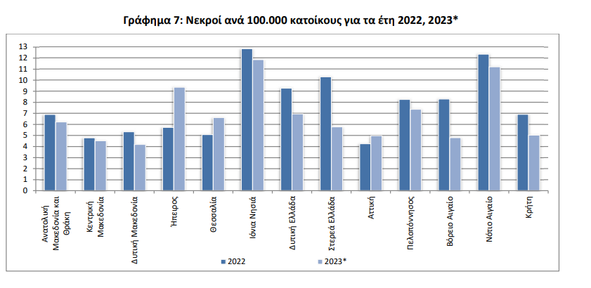 Όσον αφορά τον αριθμό των νεκρών, αναλογικά με τον πληθυσμό, τη θλιβερή πρωτιά είχαν οι Περιφέρειες Ιονίων Νήσων, Νοτίου Αιγαίου, και Ηπείρου με την τελευταία να έχει σημαντική αύξηση σε σχέση με το 2022. Από κοντά ακολούθησαν η Πελοπόννησος, η Δυτική Ελλάδα και η Θεσσαλία. Οι δύο Περιφέρειες με το μικρότερο αριθμό νεκρών αναλογικά με τον πληθυσμό ήταν η Δυτική Μακεδονία και η Κεντρική Μακεδονία.