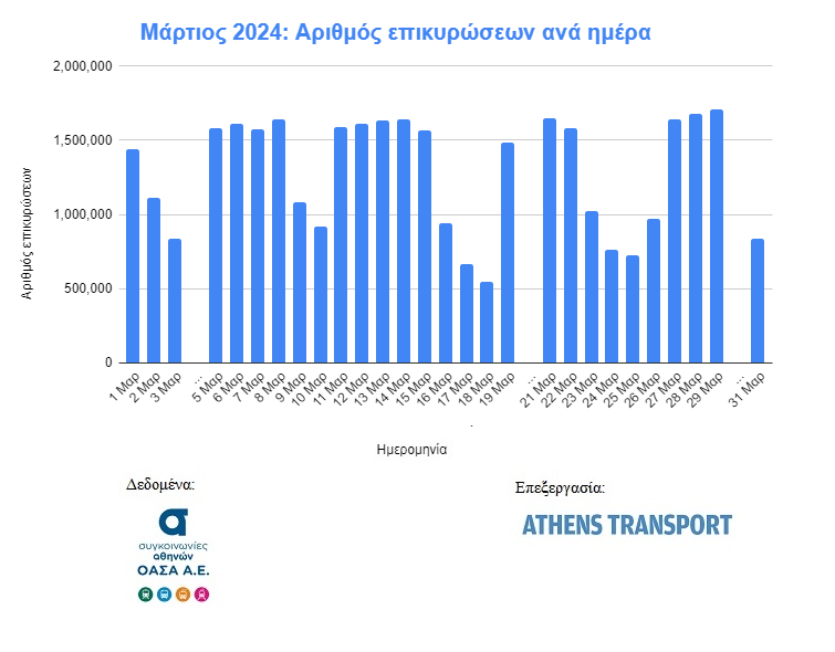 Το Μάρτιο του 2024, καταγράφηκαν συνολικά 36.050.157 επικυρώσεις εισιτηρίων. Ο ημερήσιος μέσος όρος των επικυρώσεων ανήλθε σε 1.287.506, καταγράφοντας αύξηση +8,7% σε σχέση με το Μάρτιο του 2023, όταν ο ημερήσιος μέσος όρος ήταν 1.184.158 επικυρώσεις.