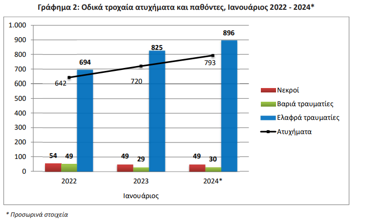 Σύμφωνα με τα προσωρινά στοιχεία της ΕΛ.ΣΤΑΤ. για τον Ιανουάριο του 2024, τα οδικά τροχαία ατυχήματα που συνέβησαν σε ολόκληρη τη χώρα που προκάλεσαν το θάνατο ή τον τραυματισμό ατόμων ήταν 793αυξημένα κατά +10,1% σε σύγκριση με τον αντίστοιχο μήνα του 2023 (720 τον Ιανουάριο του 2023). Ο αντίστοιχος αριθμός τον Ιανουάριο του 2022, ήταν 642 ατυχήματα.