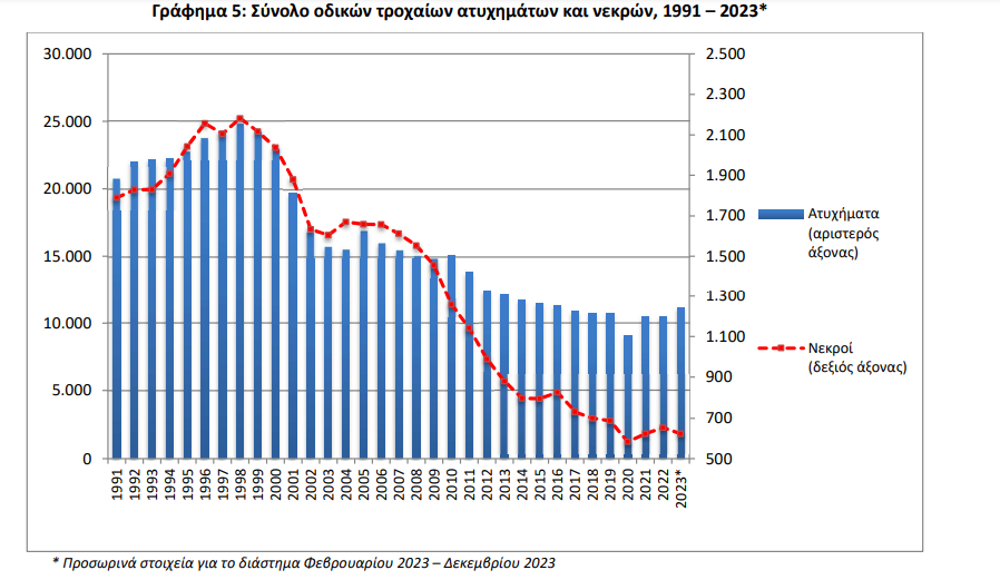 Παρακάτω, βλέπουμε το διάγραμμα της ΕΛ.ΣΤΑΤ. με τους αριθμούς των τροχαίων και των νεκρών την περίοδο 1991-2023: