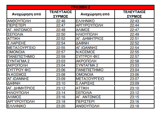 Στις γραμμές 2 και 3 του Μετρό οι τελευταίες αναχωρήσεις από το Σύνταγμα θα γίνουν στις 23:00. Αναλυτικά οι ώρες διέλευσης των τελευταίων δρομολογίων: