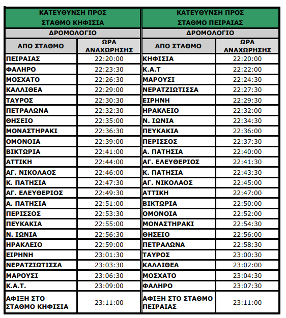 Στη γραμμή 1 του Μετρό (ΗΣΑΠ) τα τελευταία δρομολόγια θα αναχωρήσουν από τον Πειραιά και την Κηφισιά στις 22:20: