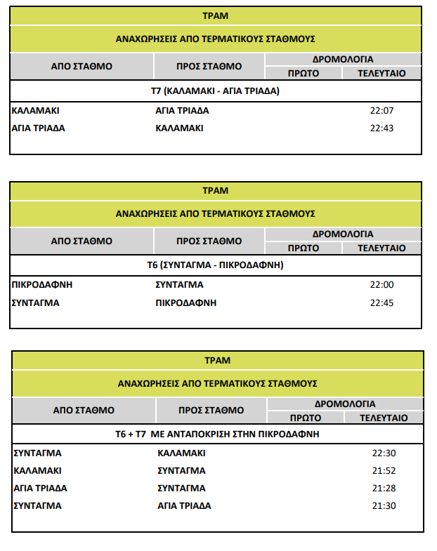 Στο Τραμ, τα τελευταία δρομολόγια θα αναχωρήσουν από τις αφετηρίες μεταξύ 22:00 – 22:45, ωστόσο τα τελευταία δρομολόγια που θα έχουν ανταπόκριση στη στάση Πικροδάφνη θα αναχωρήσουν νωρίτερα: