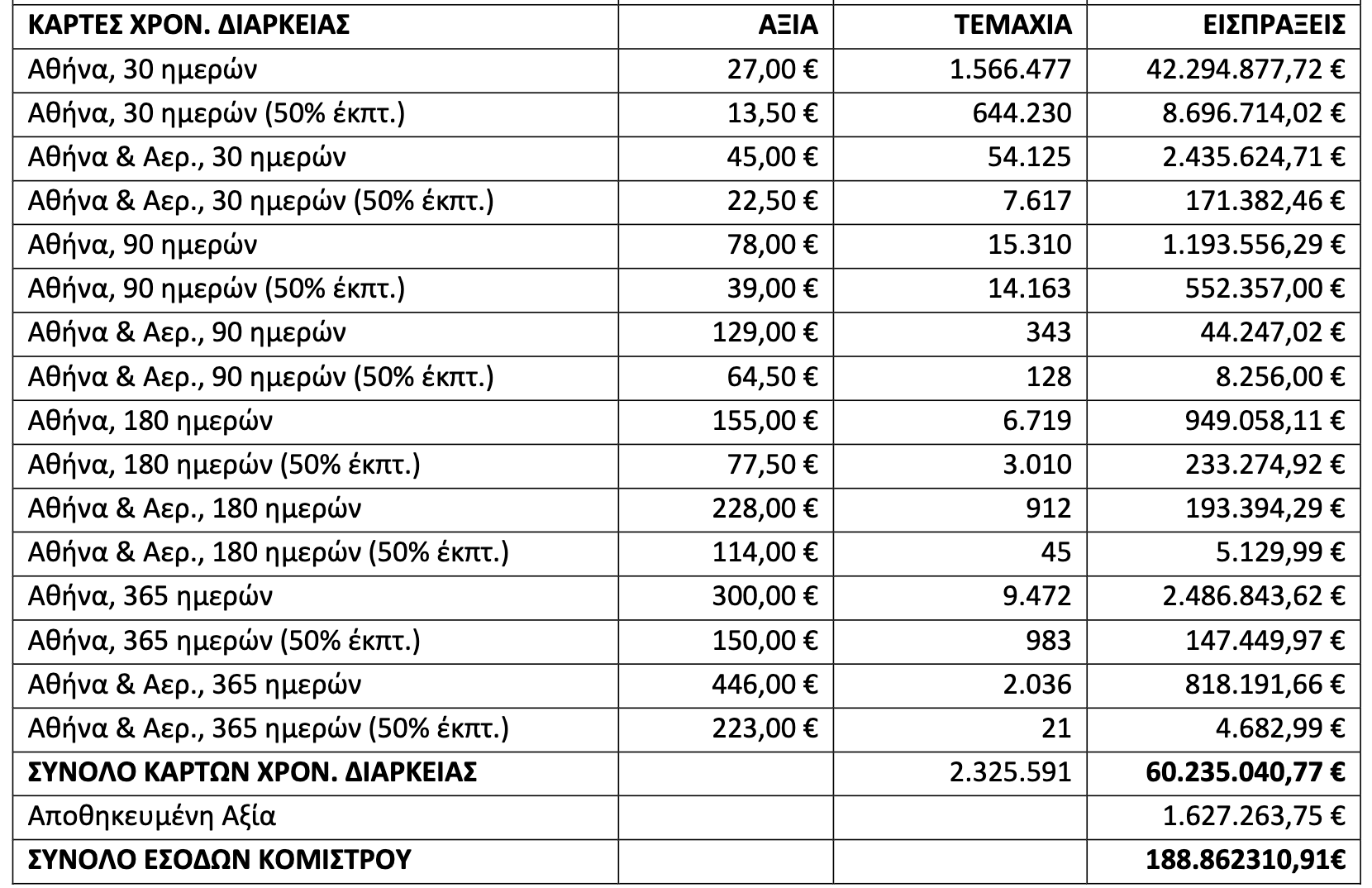 Στις κάρτες μεγαλύτερης διάρκειας, ο μεγαλύτερος τζίρος προήλθε από την κάρτα των 30 ημερών με εισπράξεις 42,2 εκατ. ευρώ και πωλήσεις 1,5 εκατ. τεμαχίων. Ακολούθησε (εξαιρουμένων των μειωμένων καρτών 30 ημερών) η κάρτα 365 ημερών με 9.472 πωλήσεις και τζίρο 2,4 εκατ. ευρώ και η αεροδρομιακή κάρτα 30 ημερών με 54 χιλιάδες πωλήσεις και τζίρο επίσης 2,4 εκατ. ευρώ. Οι λιγότερο δημοφιλείς κάρτες ήταν οι αεροδρομιακές των 90 και 180 ημερών.