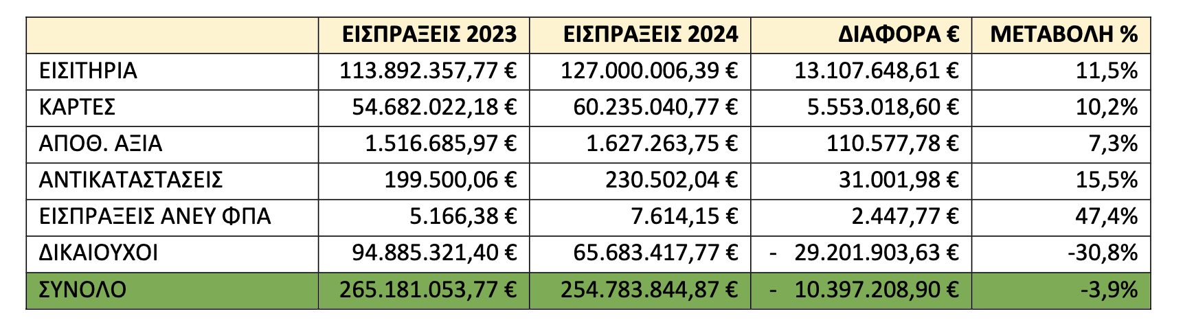 Αξιοσημείωτο πάντως ήταν πως το 2024 ήταν η πρώτη χρονιά κατά την οποία οι αγορές εισιτηρίων με τη χρήση τραπεζικών καρτών ξεπέρασαν τις αγορές με τη χρήση μετρητών. Κατά τη χρονιά αυτή, η αγορά πωλήσεων μέσω καρτών έφτασε στο 52,1% των εισπράξεων έναντι 47,4% του 2023.