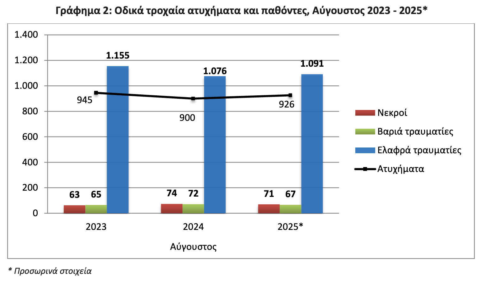 Σύμφωνα με τα προσωρινά στοιχεία της ΕΛΣΤΑΤ για τον Αύγουστο του 2025, τα οδικά τροχαία ατυχήματα που συνέβησαν σε ολόκληρη τη χώρα που προκάλεσαν το θάνατο ή τον τραυματισμό ατόμων ήταν 926, αυξημένα κατά 2,9% σε σύγκριση με τον αντίστοιχο μήνα του 2024 (900 τον Αύγουστο του 2024). Ο αντίστοιχος αριθμός τον Αύγουστο του 2023, ήταν 945 ατυχήματα.