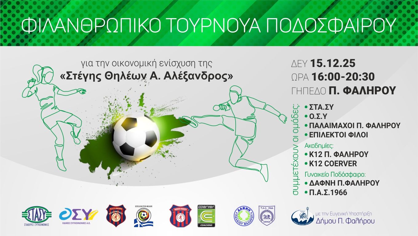 Ένα φιλανθρωπικό τουρνουά ποδοσφαίρου θα πραγματοποιηθεί στο Παλαιό Φάληρο τη Δευτέρα 15 Δεκεμβρίου 2025 με σκοπό την οικονομική ενίσχυση της Στέγης Θηλέων Α. Αλέξανδρος.