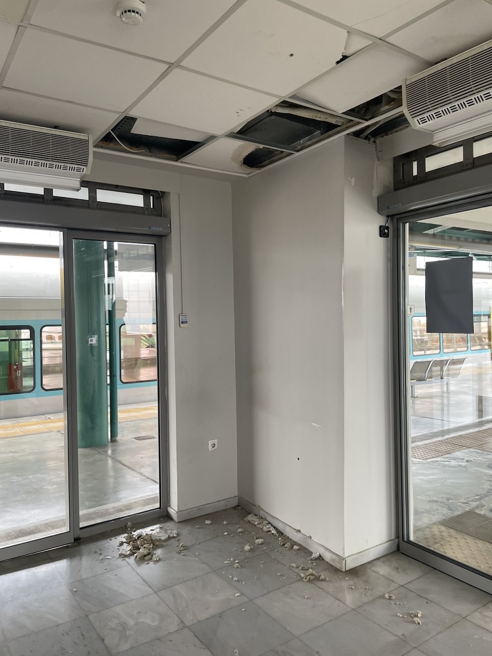 Καλό θα ήταν πάντως η διοίκηση των Σιδηροδρόμων Ελλάδος να επισκέπτεται τουλάχιστον τους σταθμούς -που λειτουργούν υπό την ευθύνη τους- έστω και με το αυτοκίνητο για να δουν σε τι κατάσταση βρίσκονται. Όπως για παράδειγμα ο σταθμός του Κιάτου όπου με τις βροχές της περασμένης εβδομάδας άρχισαν να πέφτουν σοβάδες και η ψευδοροφή του σταθμού υποχώρησε: