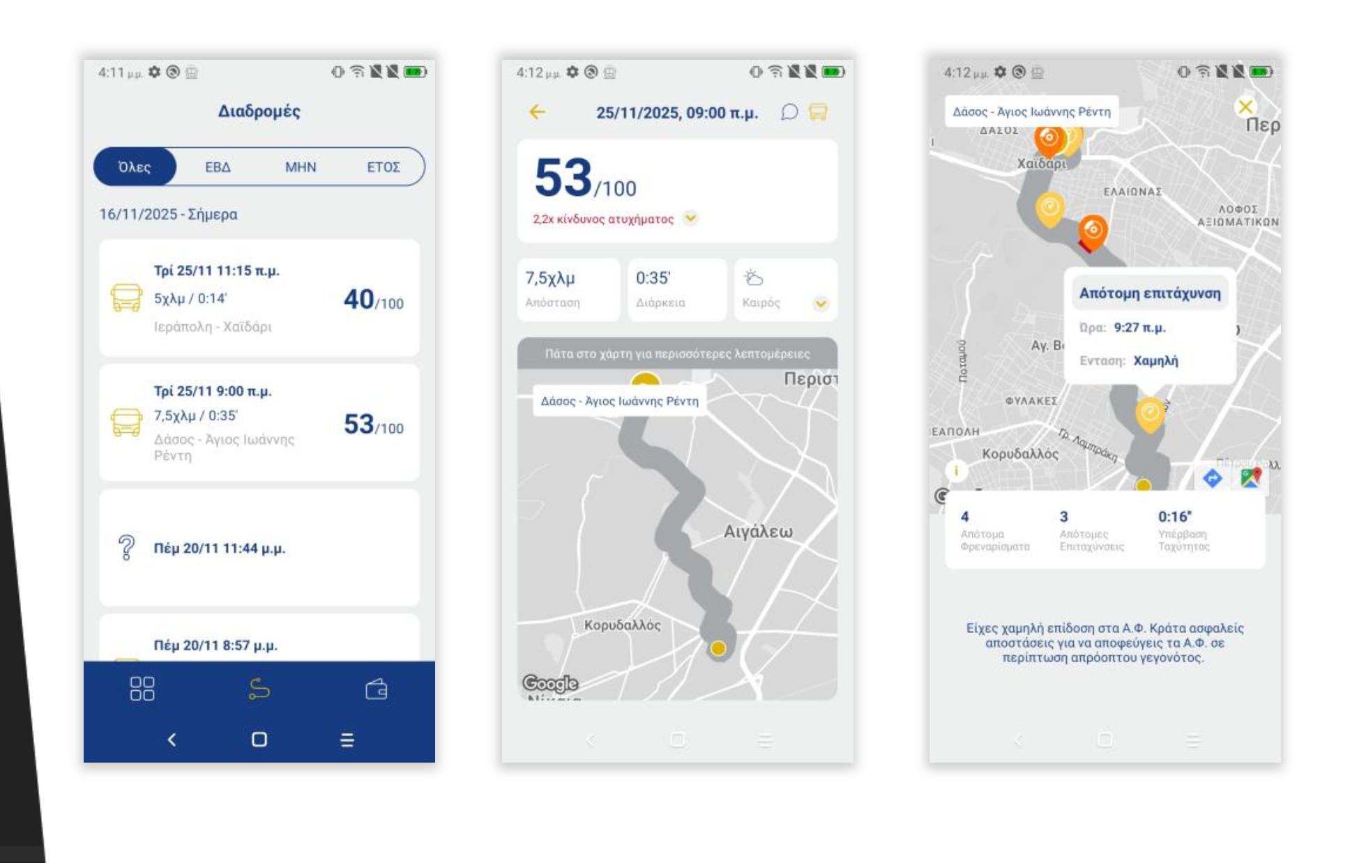 - Φρενάρισμα: συχνότητα και ένταση απότομου φρεναρίσματος και συνολική επιθετική συμπεριφορά φρεναρίσματος κατά τη διάρκεια της διαδρομής